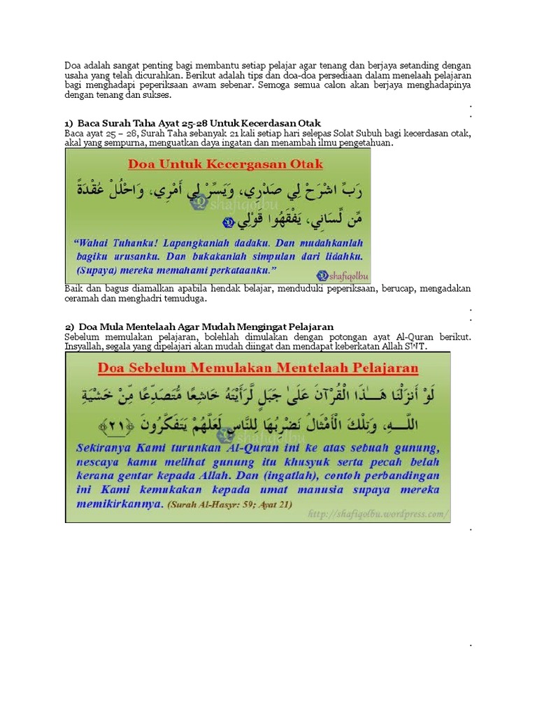 Saya harap doa-doa pilihan ini akan dapat membantu sedikit sebanyak anak-anak dan pelajar serta sesiapa sahaja yang bakal berhadapan dengan peperiksaan. Selepas temuduga banyakkan berdoa dan solat hajat agar berjaya mendapat karier yang diidamkan. Setelah membuat persiapan sebelum temuduga anda boleh berjaya dalam temuduga dengan mengikuti tips berikut.